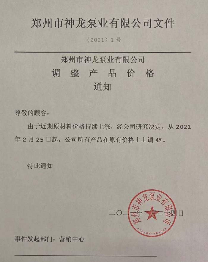 本公司所有產(chǎn)品于2021年3月1日起在12月15日調(diào)價的基礎上銷售價格再次上調(diào)4%